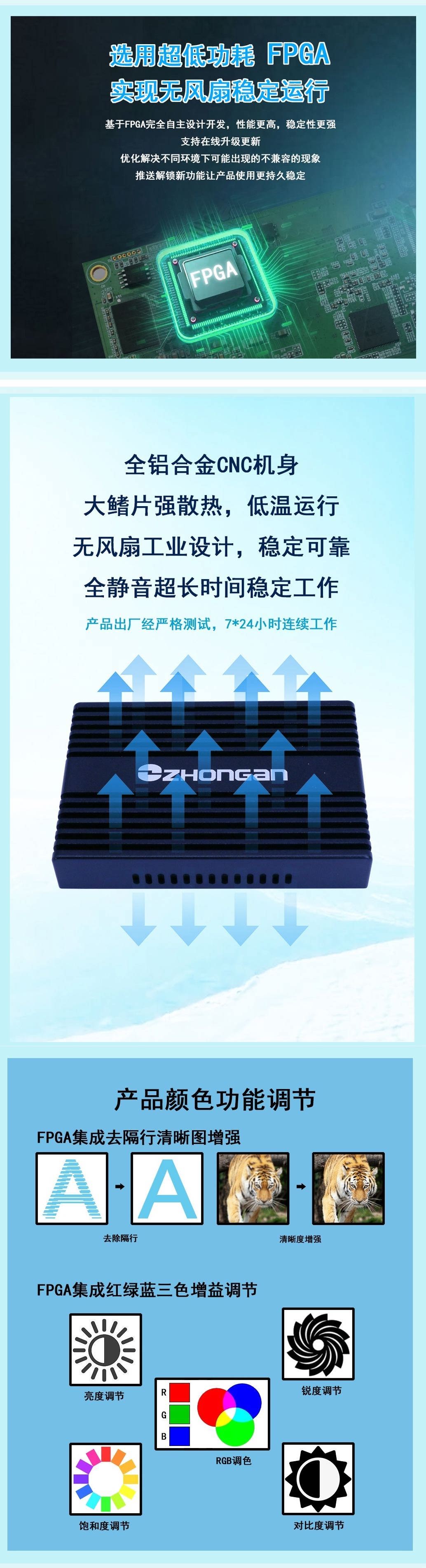 产品特性 | 采用Lattice Fpga完全自主设计开发 采用TYPE-C接口,采用UVC设计不需安装驱动即插即用 支持一路4K 60fps HDMI输入和一路4K 60fps HDMI环通输出 1个line in模拟音频输入 和一路音频输出 采用超低功耗设计,设备运行完全不发热保证7×24小时稳定运行。 FPGA集成高质量运动预估自适应去隔行算法 FPGA集成高质量双线性图像缩放算法,可实现多级高质量图像缩放 FPGA集成高精度色彩空间转换算法,支持RGB24、NV12、YUV422格式输出 FPGA集成亮度,对比度,饱和度,和清晰度增强算法,实现多级色彩调节。 FPGA集RGB红绿蓝三色单独增益调节,更精细化调节色差风格 FPGA集成音频重采样和音频混用算法 支持标准Windows DirectShow和linux V4L2架构及支持流媒体采集 |